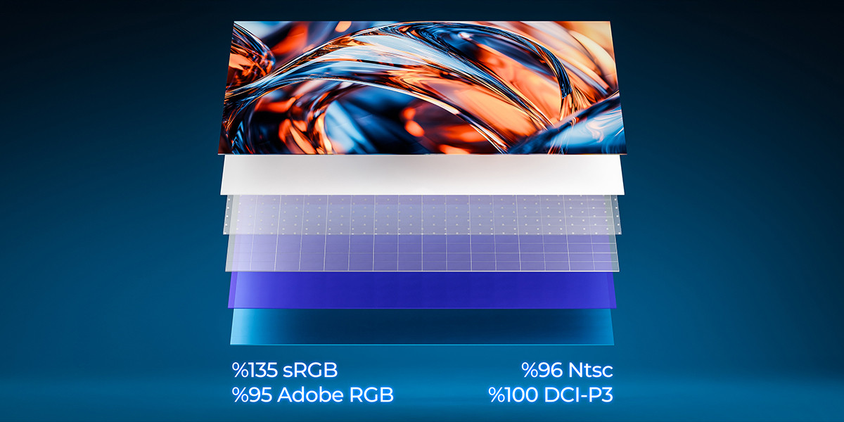 %135 sRGB, %96 NTSC, %95 Adobe RGB ve %100 DCI-P3 desteği ile her sahnede olağanüstü renk doğruluğu.