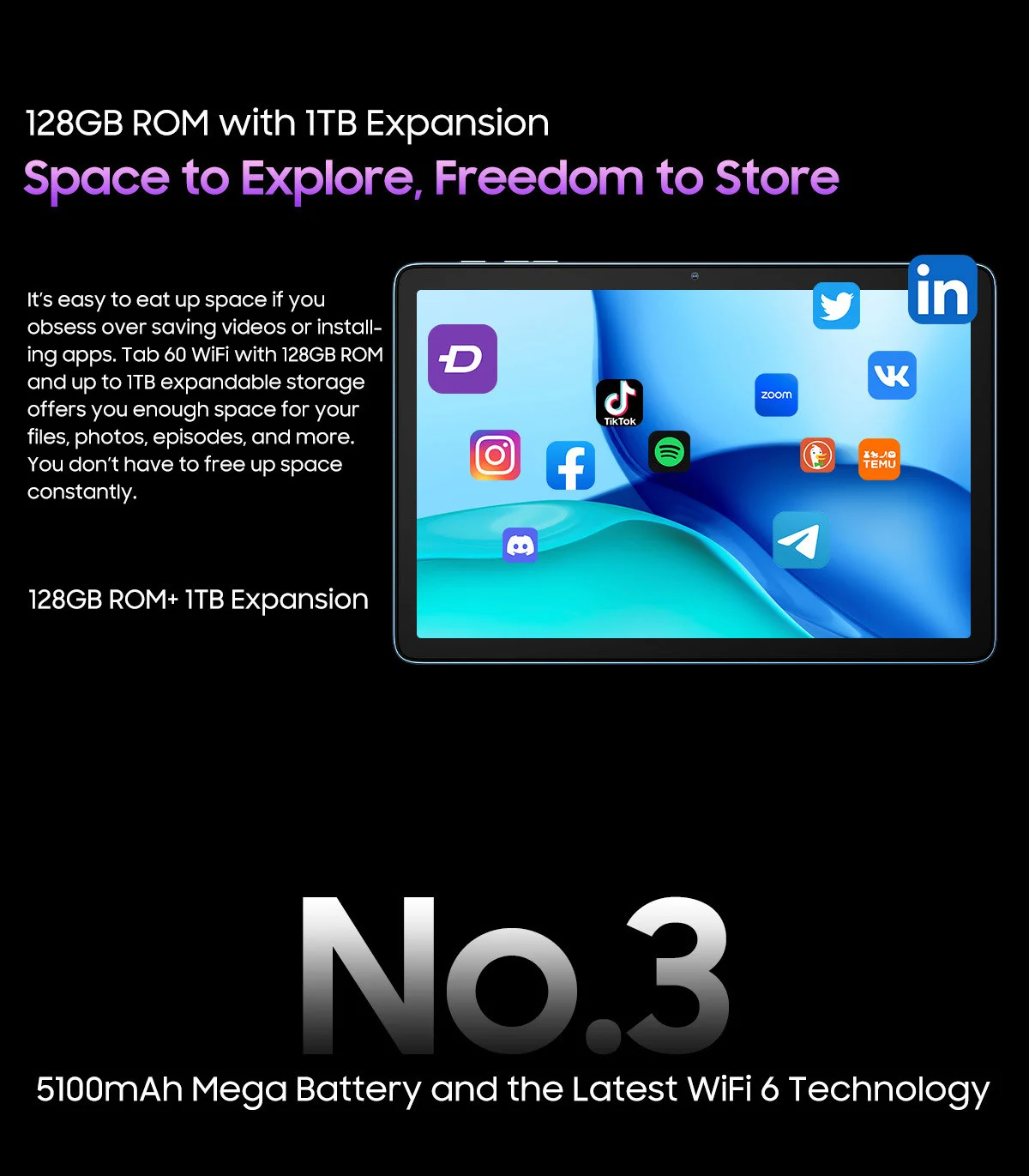 Toplam 128Gb hafıza ve 12GB'a varan Ram kapasitesi ile TAB60WIFI'yi deneyimleyin.