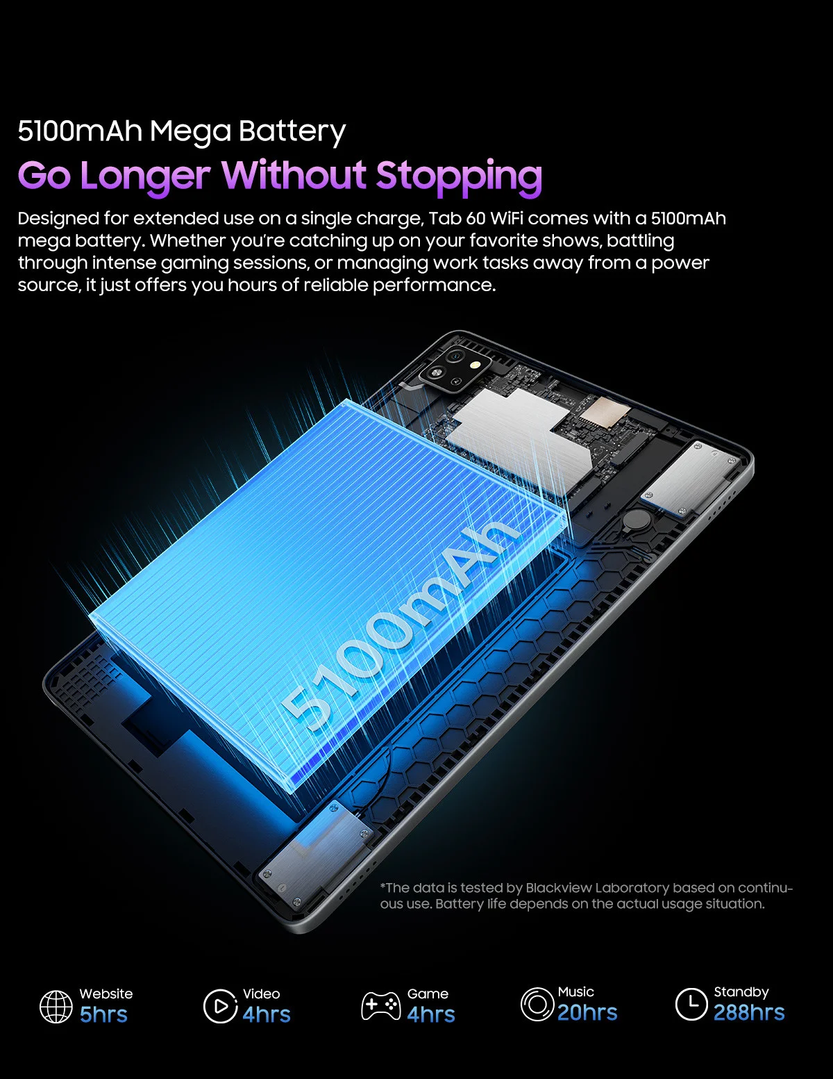 TAB60 WIFI ile birlikte 5100mAh bataryanın keyfini çıkarabilirsiniz. 4 Saat'e kadar oyun oynayabilir, video izleyebilir ve 20 saat'e kadar müzik dinleyebilirsiniz.