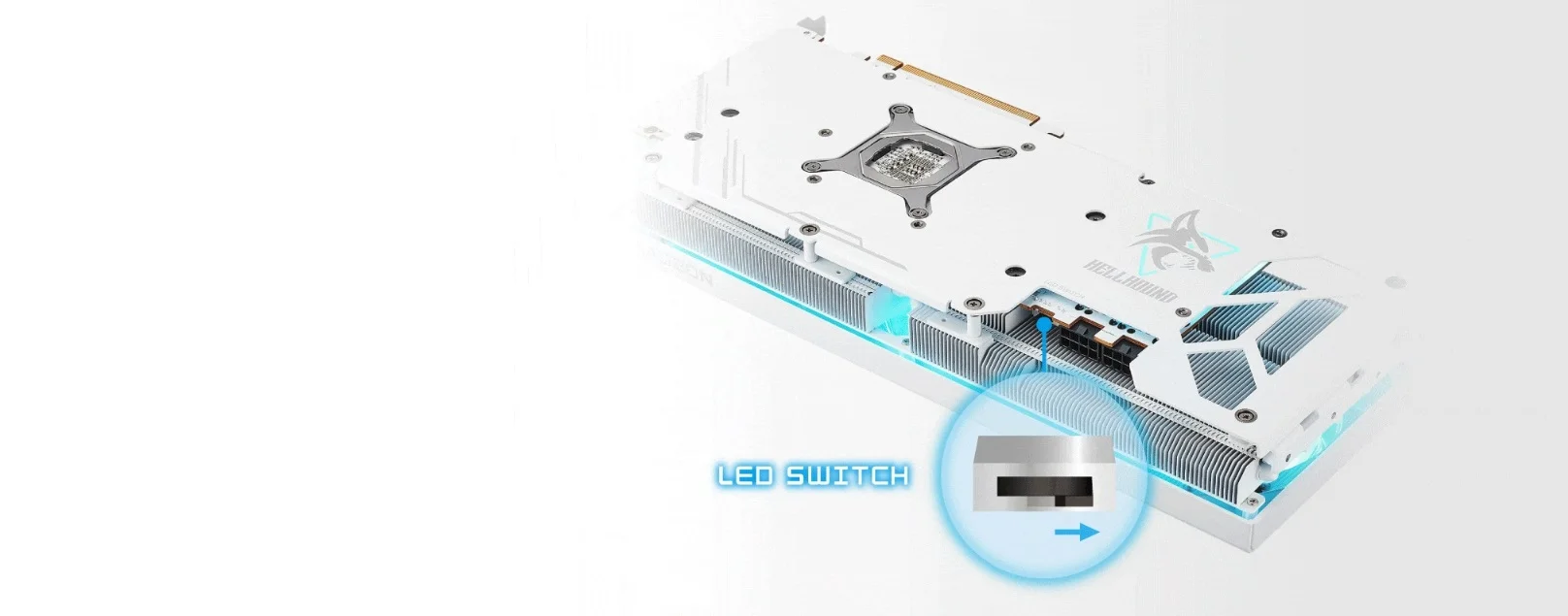 Bu neslin Hellhound'u artık iki LED renk seçeneğiyle geliyor. Oyuncular kartın yan tarafındaki düğmeyi çevirerek istedikleri rengi seçebiliyorlar.Buz mavisi Hellhound'un serinliğini gösterirken, buzlu beyaz canlı, sakin ve zarafet yansıtır.